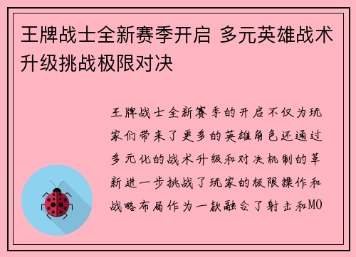 王牌战士全新赛季开启 多元英雄战术升级挑战极限对决