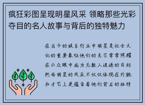 疯狂彩图呈现明星风采 领略那些光彩夺目的名人故事与背后的独特魅力