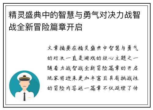 精灵盛典中的智慧与勇气对决力战智战全新冒险篇章开启